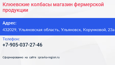 Клюевские колбасы, магазин фермерской продукции по адресу 432029, Ульяновская область, Ульяновск, Корунковой, 23а в дальнейшем Организация, размещена в следующих категориях: