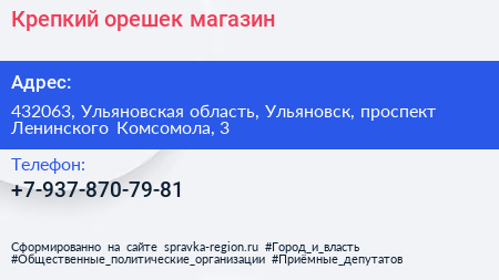 Крепкий орешек, магазин по адресу 432063, Ульяновская область, Ульяновск, проспект Ленинского Комсомола, 3 в дальнейшем Организация, размещена в следующих категориях: