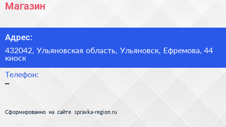 Магазин по адресу 432042, Ульяновская область, Ульяновск, Ефремова, 44 киоск в дальнейшем Организация, размещена в следующих категориях: