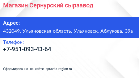 Магазин, Сернурский сырзавод по адресу 432049, Ульяновская область, Ульяновск, Аблукова, 39а в дальнейшем Организация, размещена в следующих категориях: