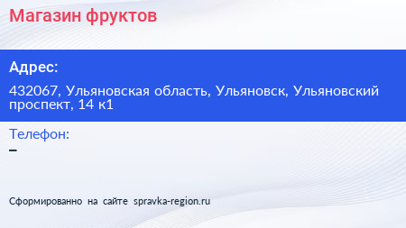 Магазин фруктов по адресу 432067, Ульяновская область, Ульяновск, Ульяновский проспект, 14 к1 в дальнейшем Организация, размещена в следующих категориях: