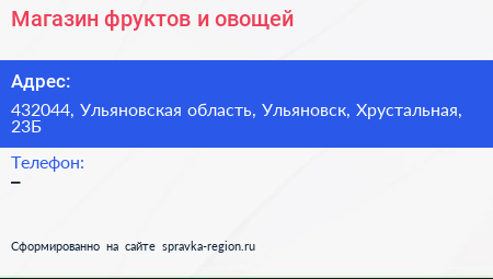 Магазин фруктов и овощей по адресу 432044, Ульяновская область, Ульяновск, Хрустальная, 23Б в дальнейшем Организация, размещена в следующих категориях: