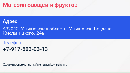 Магазин овощей и фруктов по адресу 432042, Ульяновская область, Ульяновск, Богдана Хмельницкого, 24а в дальнейшем Организация, размещена в следующих категориях: