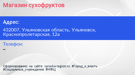 Магазин сухофруктов по адресу 432007, Ульяновская область, Ульяновск, Краснопролетарская, 12а в дальнейшем Организация, размещена в следующих категориях: