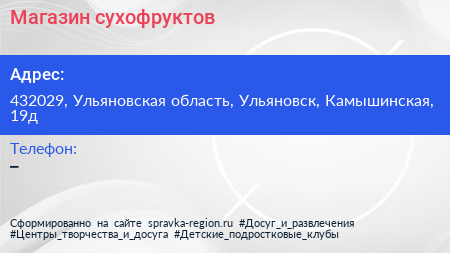 Магазин сухофруктов по адресу 432029, Ульяновская область, Ульяновск, Камышинская, 19д в дальнейшем Организация, размещена в следующих категориях: