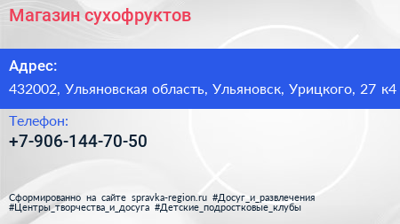 Магазин сухофруктов по адресу 432002, Ульяновская область, Ульяновск, Урицкого, 27 к4 в дальнейшем Организация, размещена в следующих категориях: