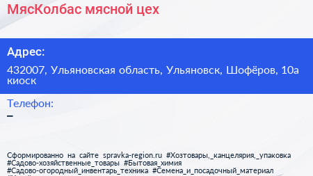 МясКолбас, мясной цех по адресу 432007, Ульяновская область, Ульяновск, Шофёров, 10а киоск в дальнейшем Организация, размещена в следующих категориях: