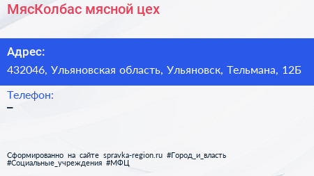 МясКолбас, мясной цех по адресу 432046, Ульяновская область, Ульяновск, Тельмана, 12Б в дальнейшем Организация, размещена в следующих категориях: