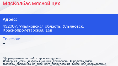 МясКолбас, мясной цех по адресу 432007, Ульяновская область, Ульяновск, Краснопролетарская, 16в в дальнейшем Организация, размещена в следующих категориях: