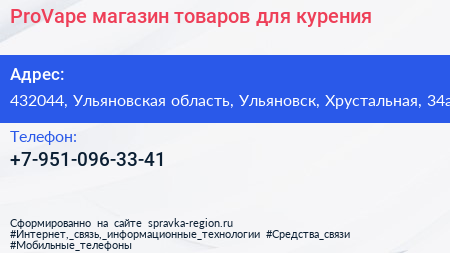 ProVape, магазин товаров для курения по адресу 432044, Ульяновская область, Ульяновск, Хрустальная, 34а в дальнейшем Организация, размещена в следующих категориях:
