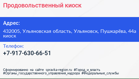 Продовольственный киоск по адресу 432005, Ульяновская область, Ульяновск, Пушкарёва, 44а киоск в дальнейшем Организация, размещена в следующих категориях: