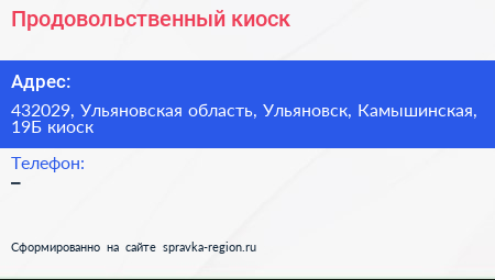 Продовольственный киоск по адресу 432029, Ульяновская область, Ульяновск, Камышинская, 19Б киоск в дальнейшем Организация, размещена в следующих категориях: