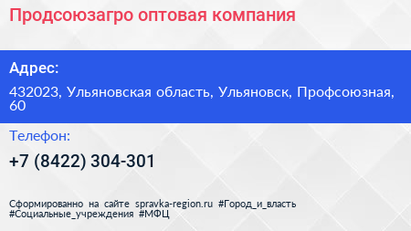 Продсоюзагро, оптовая компания по адресу 432023, Ульяновская область, Ульяновск, Профсоюзная, 60 в дальнейшем Организация, размещена в следующих категориях:
