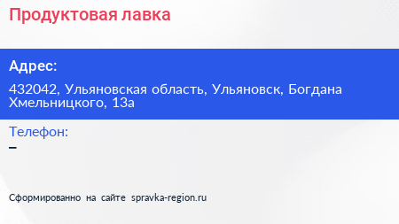 Продуктовая лавка по адресу 432042, Ульяновская область, Ульяновск, Богдана Хмельницкого, 13а в дальнейшем Организация, размещена в следующих категориях: