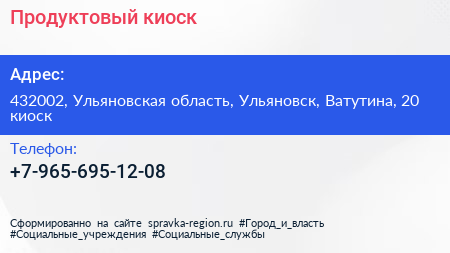 Продуктовый киоск по адресу 432002, Ульяновская область, Ульяновск, Ватутина, 20 киоск в дальнейшем Организация, размещена в следующих категориях: