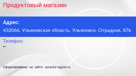Продуктовый магазин по адресу 432066, Ульяновская область, Ульяновск, Отрадная, 87в в дальнейшем Организация, размещена в следующих категориях: