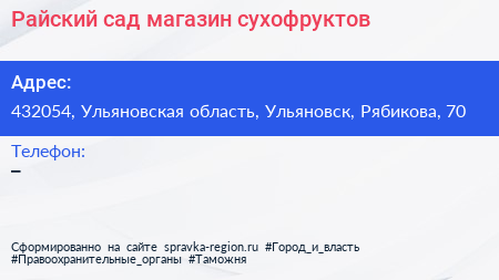 Райский сад, магазин сухофруктов по адресу 432054, Ульяновская область, Ульяновск, Рябикова, 70 в дальнейшем Организация, размещена в следующих категориях: