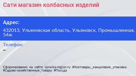 Сати, магазин колбасных изделий по адресу 432013, Ульяновская область, Ульяновск, Промышленная, 54ж в дальнейшем Организация, размещена в следующих категориях: