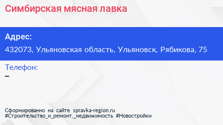 Симбирская мясная лавка по адресу 432073, Ульяновская область, Ульяновск, Рябикова, 75 в дальнейшем Организация, размещена в следующих категориях: