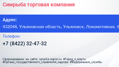 Симрыба, торговая компания по адресу 432048, Ульяновская область, Ульяновск, Локомотивная, 8 в дальнейшем Организация, размещена в следующих категориях: