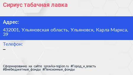 Сириус, табачная лавка по адресу 432001, Ульяновская область, Ульяновск, Карла Маркса, 39 в дальнейшем Организация, размещена в следующих категориях: