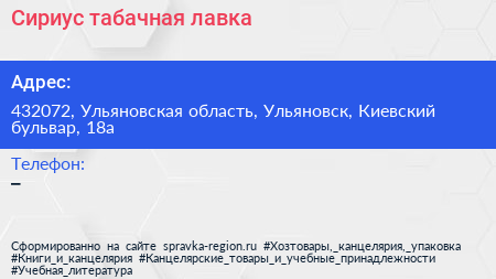 Сириус, табачная лавка по адресу 432072, Ульяновская область, Ульяновск, Киевский бульвар, 18а в дальнейшем Организация, размещена в следующих категориях: