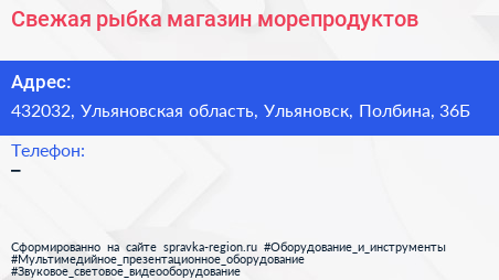 Свежая рыбка, магазин морепродуктов по адресу 432032, Ульяновская область, Ульяновск, Полбина, 36Б в дальнейшем Организация, размещена в следующих категориях: