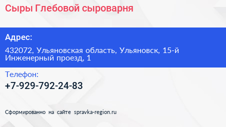 Сыры Глебовой, сыроварня по адресу 432072, Ульяновская область, Ульяновск, 15-й Инженерный проезд, 1 в дальнейшем Организация, размещена в следующих категориях: