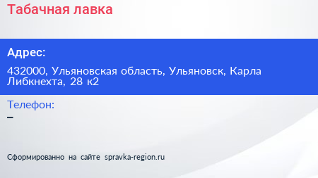 Табачная лавка по адресу 432000, Ульяновская область, Ульяновск, Карла Либкнехта, 28 к2 в дальнейшем Организация, размещена в следующих категориях:
