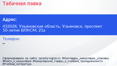 Табачная лавка по адресу 432028, Ульяновская область, Ульяновск, проспект 50-летия ВЛКСМ, 21а в дальнейшем Организация, размещена в следующих категориях: