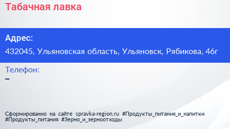 Табачная лавка по адресу 432045, Ульяновская область, Ульяновск, Рябикова, 46г в дальнейшем Организация, размещена в следующих категориях: