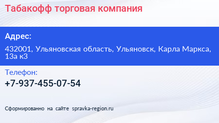 Табакофф, торговая компания по адресу 432001, Ульяновская область, Ульяновск, Карла Маркса, 13а к3 в дальнейшем Организация, размещена в следующих категориях: