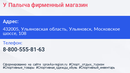 У Палыча, фирменный магазин по адресу 432005, Ульяновская область, Ульяновск, Московское шоссе, 108 в дальнейшем Организация, размещена в следующих категориях: