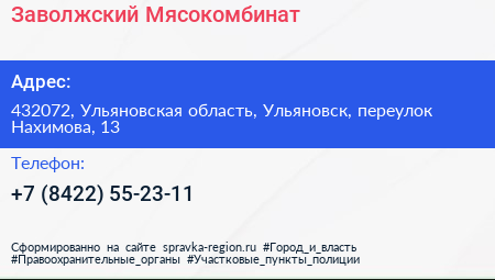 Заволжский Мясокомбинат по адресу 432072, Ульяновская область, Ульяновск, переулок Нахимова, 13 в дальнейшем Организация, размещена в следующих категориях: