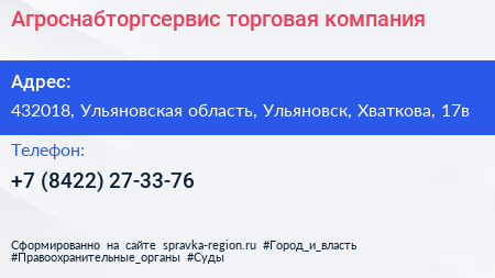 Агроснабторгсервис, торговая компания по адресу 432018, Ульяновская область, Ульяновск, Хваткова, 17в в дальнейшем Организация, размещена в следующих категориях: