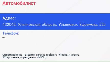Автомобилист по адресу 432042, Ульяновская область, Ульяновск, Ефремова, 52а в дальнейшем Организация, размещена в следующих категориях: