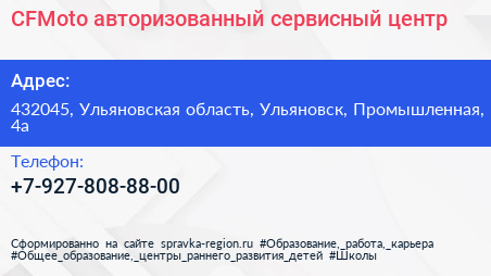CFMoto, авторизованный сервисный центр по адресу 432045, Ульяновская область, Ульяновск, Промышленная, 4а в дальнейшем Организация, размещена в следующих категориях: