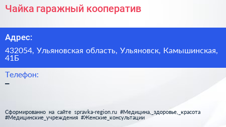 Чайка, гаражный кооператив по адресу 432054, Ульяновская область, Ульяновск, Камышинская, 41Б в дальнейшем Организация, размещена в следующих категориях: