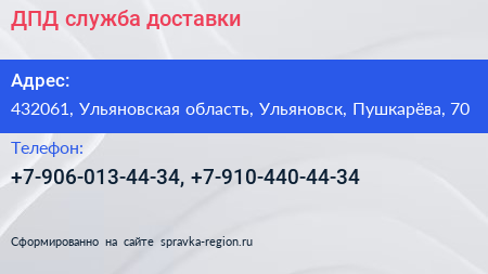 ДПД, служба доставки по адресу 432061, Ульяновская область, Ульяновск, Пушкарёва, 70 в дальнейшем Организация, размещена в следующих категориях: