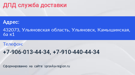 ДПД, служба доставки по адресу 432073, Ульяновская область, Ульяновск, Камышинская, 6а к1 в дальнейшем Организация, размещена в следующих категориях: