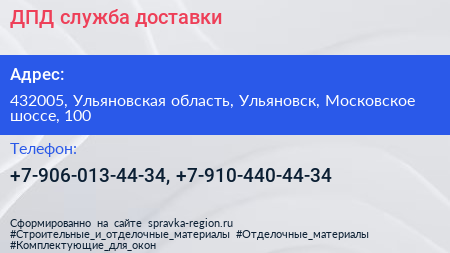 ДПД, служба доставки по адресу 432005, Ульяновская область, Ульяновск, Московское шоссе, 100 в дальнейшем Организация, размещена в следующих категориях: