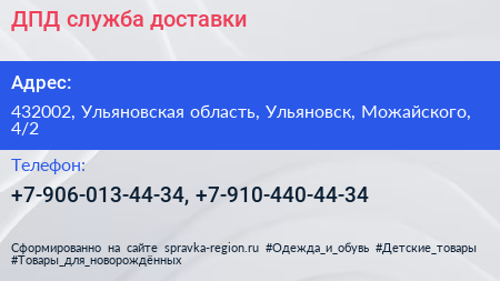 ДПД, служба доставки по адресу 432002, Ульяновская область, Ульяновск, Можайского, 4/2 в дальнейшем Организация, размещена в следующих категориях: