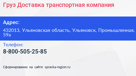 Груз-Доставка, транспортная компания по адресу 432013, Ульяновская область, Ульяновск, Промышленная, 59а в дальнейшем Организация, размещена в следующих категориях: