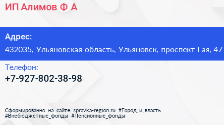 ИП Алимов Ф.А. по адресу 432035, Ульяновская область, Ульяновск, проспект Гая, 47 в дальнейшем Организация, размещена в следующих категориях: