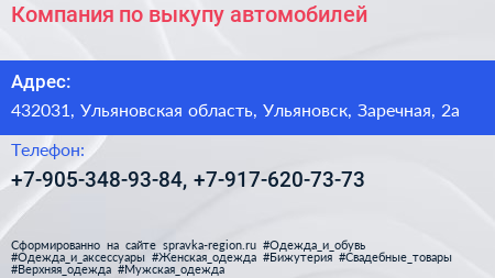 Компания по выкупу автомобилей по адресу 432031, Ульяновская область, Ульяновск, Заречная, 2а в дальнейшем Организация, размещена в следующих категориях: