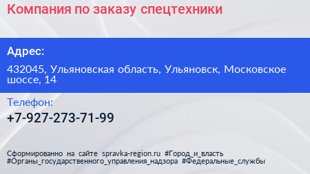 Компания по заказу спецтехники по адресу 432045, Ульяновская область, Ульяновск, Московское шоссе, 14 в дальнейшем Организация, размещена в следующих категориях: