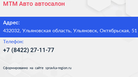 МТМ-Авто, автосалон по адресу 432032, Ульяновская область, Ульяновск, Октябрьская, 51 в дальнейшем Организация, размещена в следующих категориях: