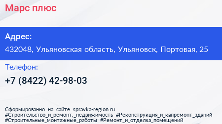 Марс плюс по адресу 432048, Ульяновская область, Ульяновск, Портовая, 25 в дальнейшем Организация, размещена в следующих категориях: