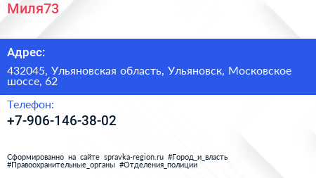Миля73 по адресу 432045, Ульяновская область, Ульяновск, Московское шоссе, 62 в дальнейшем Организация, размещена в следующих категориях: