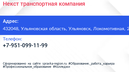Некст, транспортная компания по адресу 432048, Ульяновская область, Ульяновск, Локомотивная, 2 в дальнейшем Организация, размещена в следующих категориях: